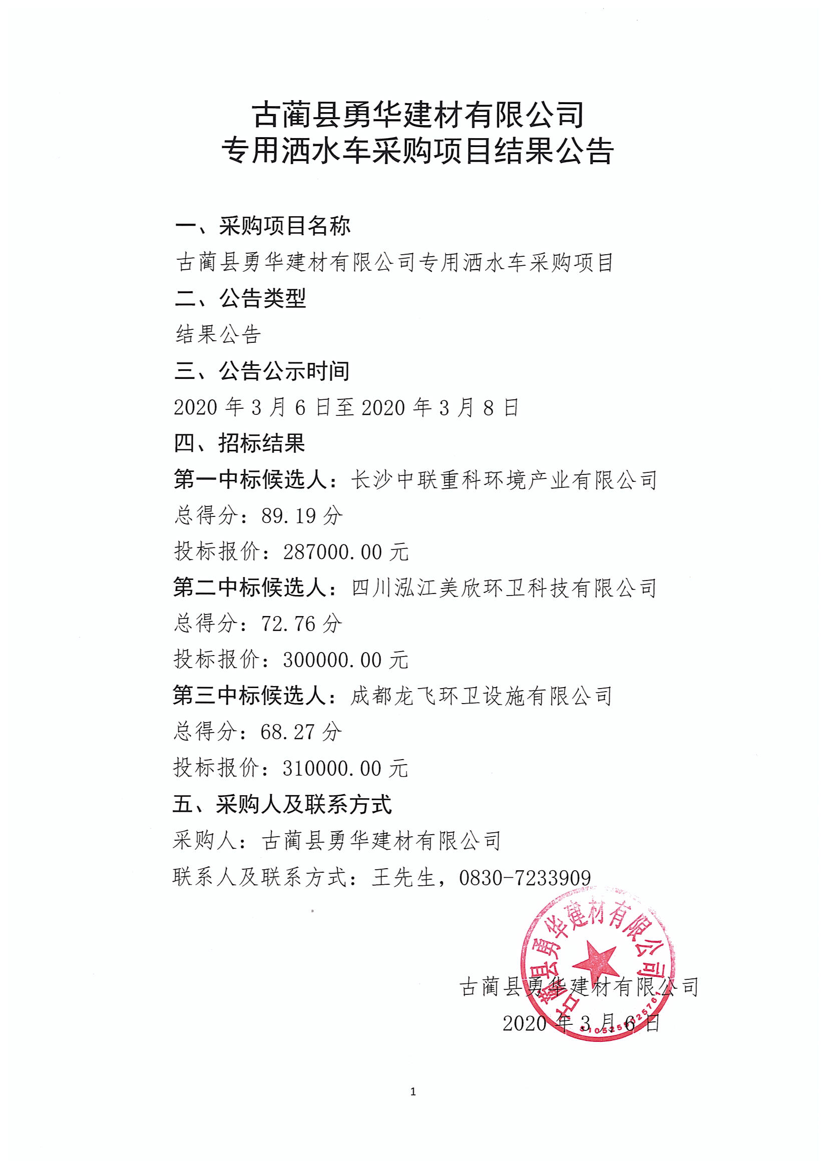 專用灑水車采購項(xiàng)目結(jié)果公告
